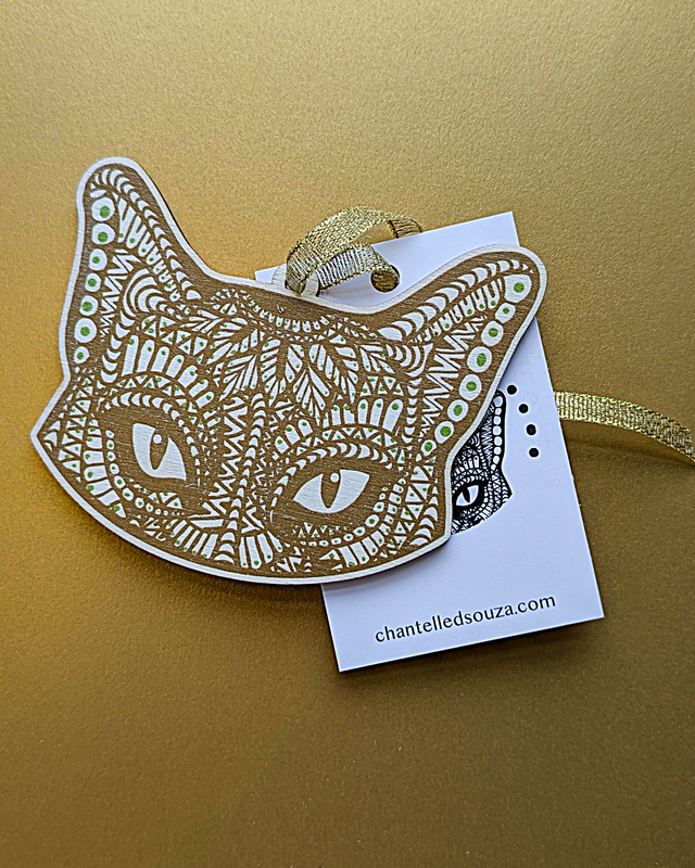 The cat face design is adorned with intricate, hand-drawn style patterns, printed using ultra low VOC UV inks for a safe, vibrant, and long-lasting finish. With its warm earthy tones, gentle green accents, and striking eyes, this ornament brings a sense of curiosity and calm wherever it is placed.