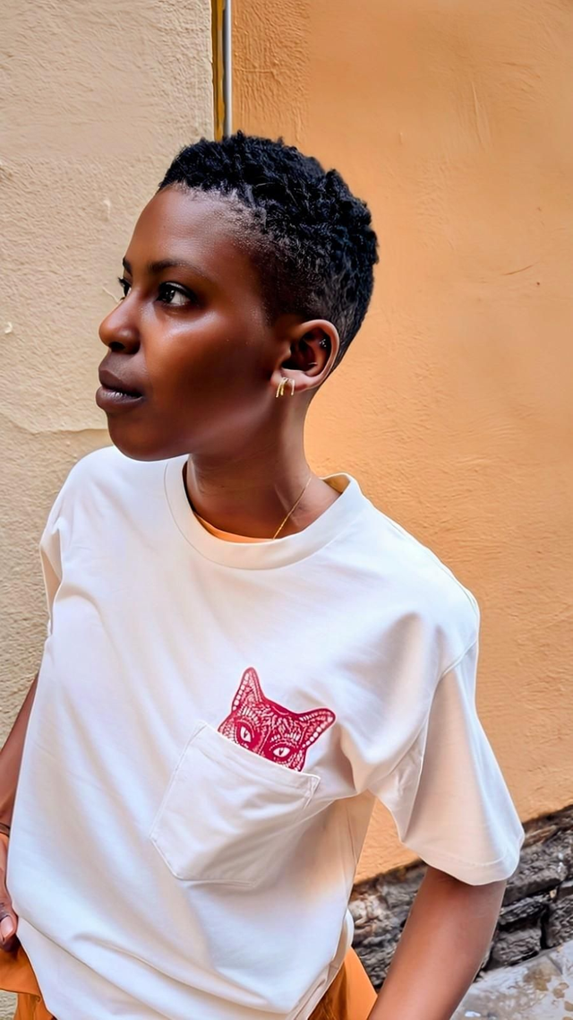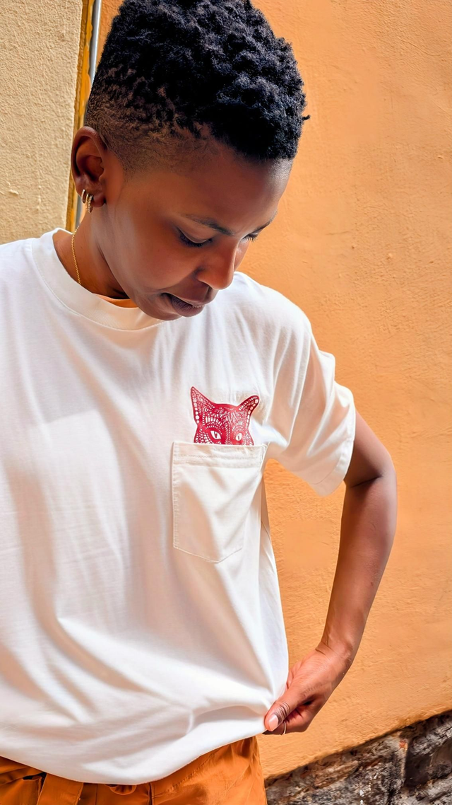 This Pocket Kitty tee in earthy red is for all the cat lovers. Made from heavy weight 220 GSM, 100% combed cotton, it boasts a relaxed fit, durable construction, and preshrunk fabric. The tonal chest pocket, neck ribbing, and double needle hems offer extra style and strength. With shoulder-to-shoulder tape and side seams, it's built to last. Easy care instructions include machine wash and line dry. Available in sizes M-XL, This tee is perfect for casual outings, lounging at home, or just showing off your feline fandom!